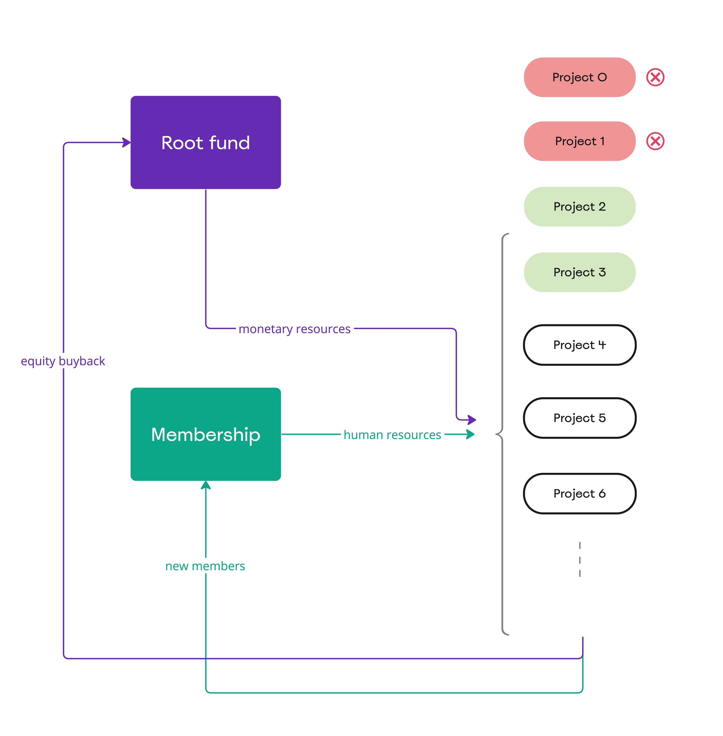 A new SOFT org starts with a root fund to produce its first line of products. Each product produced at a SOFT organization is its own autonomous sub org. Org's root fund will hold certain percentage of equity ownership in each of the products produced. Once root fund attains enough capital gain from equity buyback from the Org's first line of products, it starts to fund further product proposals submitted by members of the org.